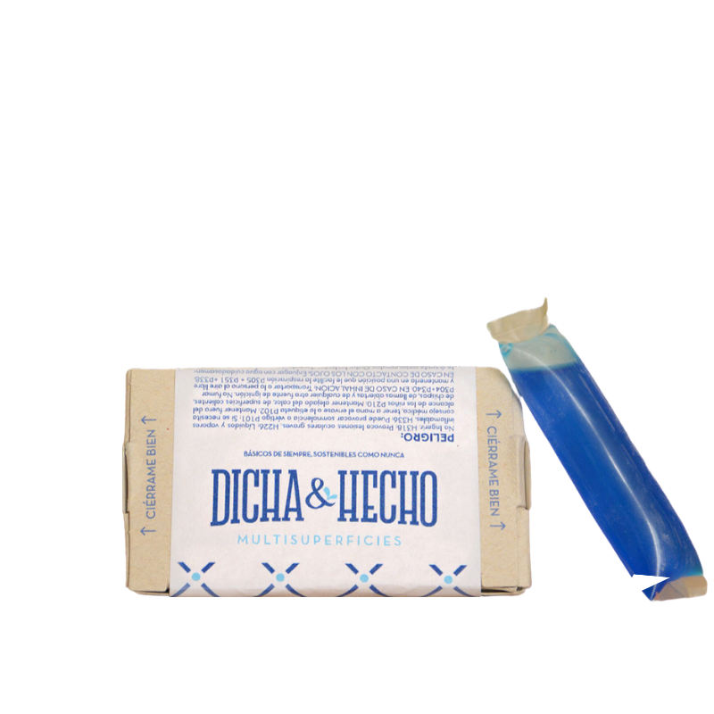 Multisuperficies y Limpiacristales con sello ecológico europeo Ecolabel en trámite, eficaz para limpiar todo tipo de superficies sin dejar velos. Sus cómodas monodosis hidrosolubles evitan desperdicios y van empaquetadas en pequeñas cajas de cartón 90% reciclado y 10% de bosques gestionados de manera sostenible de proximidad, en concreto, del Norte de España.